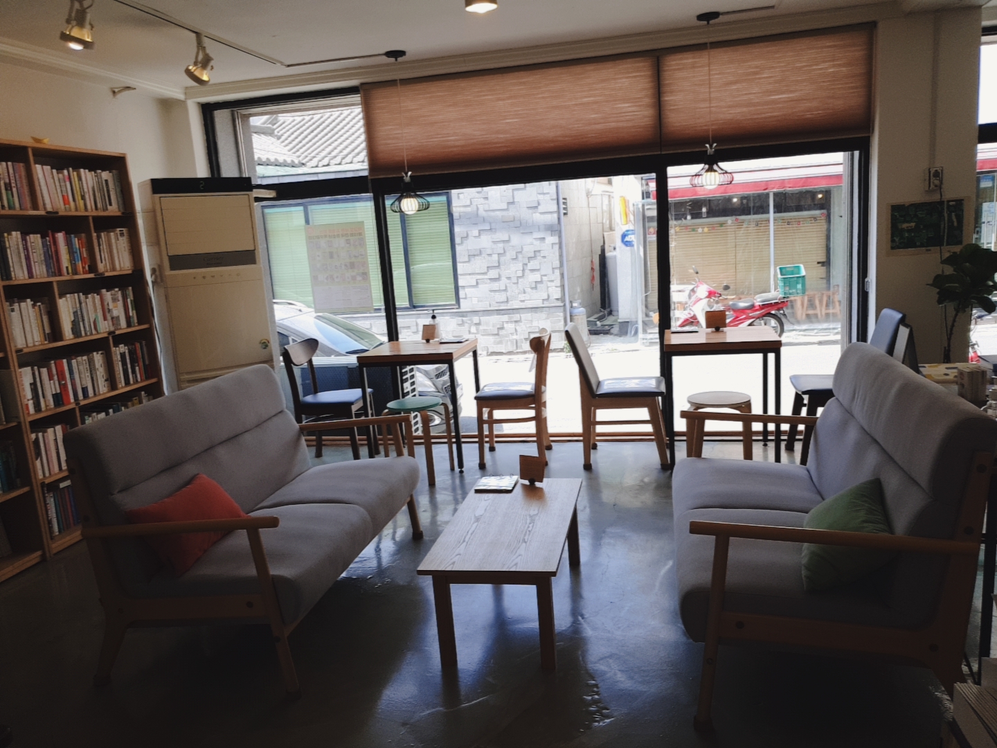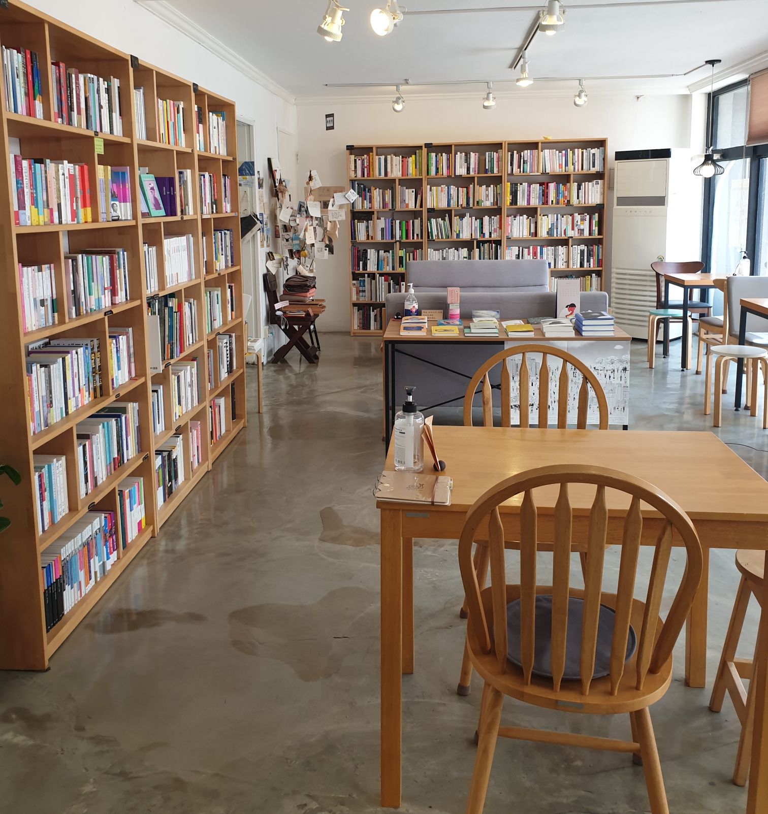 밖에서 보는 것보다 꽤 넓었어요. 책과 함께 한 인테리어도 깔끔하고. 서점인데 테이블이 꽤 보이죠? 여긴 차도 판매하는데 테이블은 음료를 주문하거나 책을 구매한 사람에 한해 이용 가능하다고 해요.