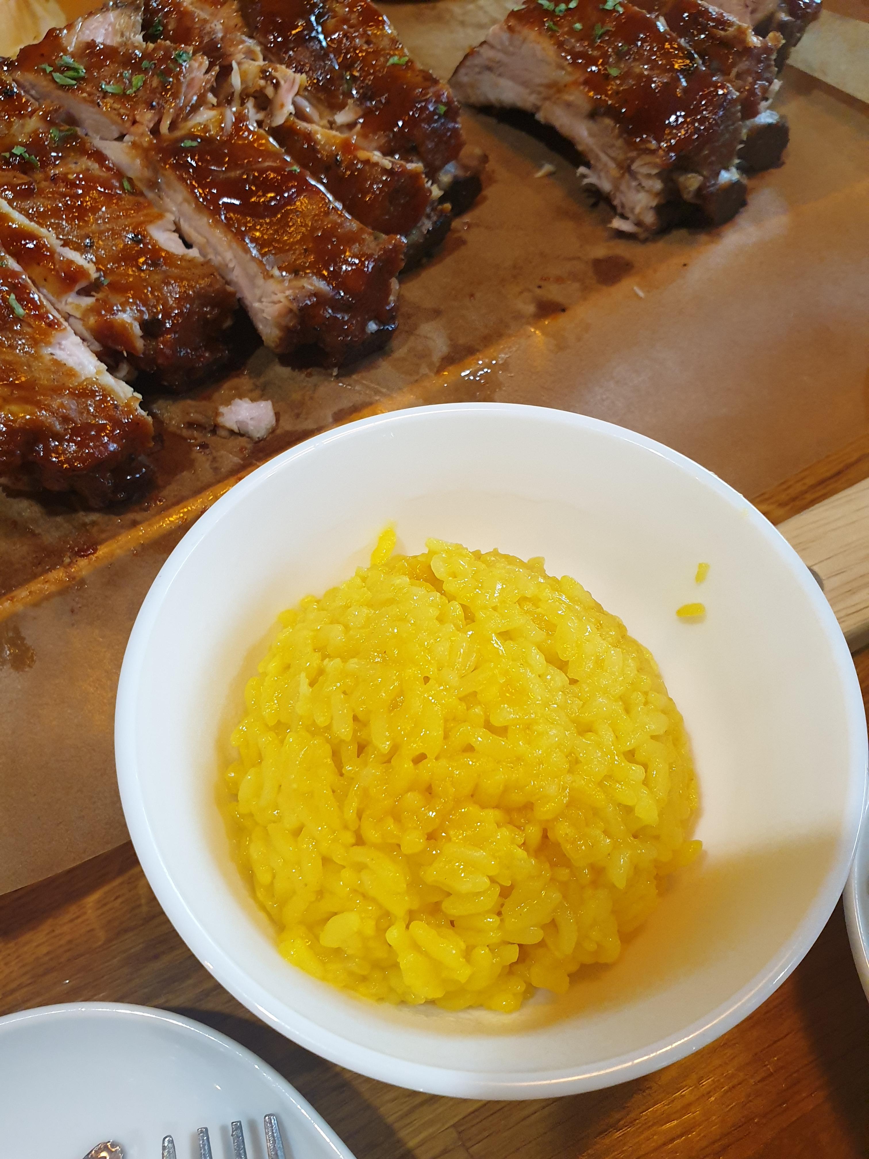 강황밥도 나오네요. 전 식당가서 이 밥을 만날 때마다 기분이 좋더라구요. 색깔이 넘나 이쁜 것ㅎ 윤기도 좔좔 흐르는 강황밥이네요. 사진 위쪽에 보이는 등갈비도 넘 맛나 보이죠? 살도 꽤 많고 잡고 뜯는 재미가 있더라구요ㅎ
