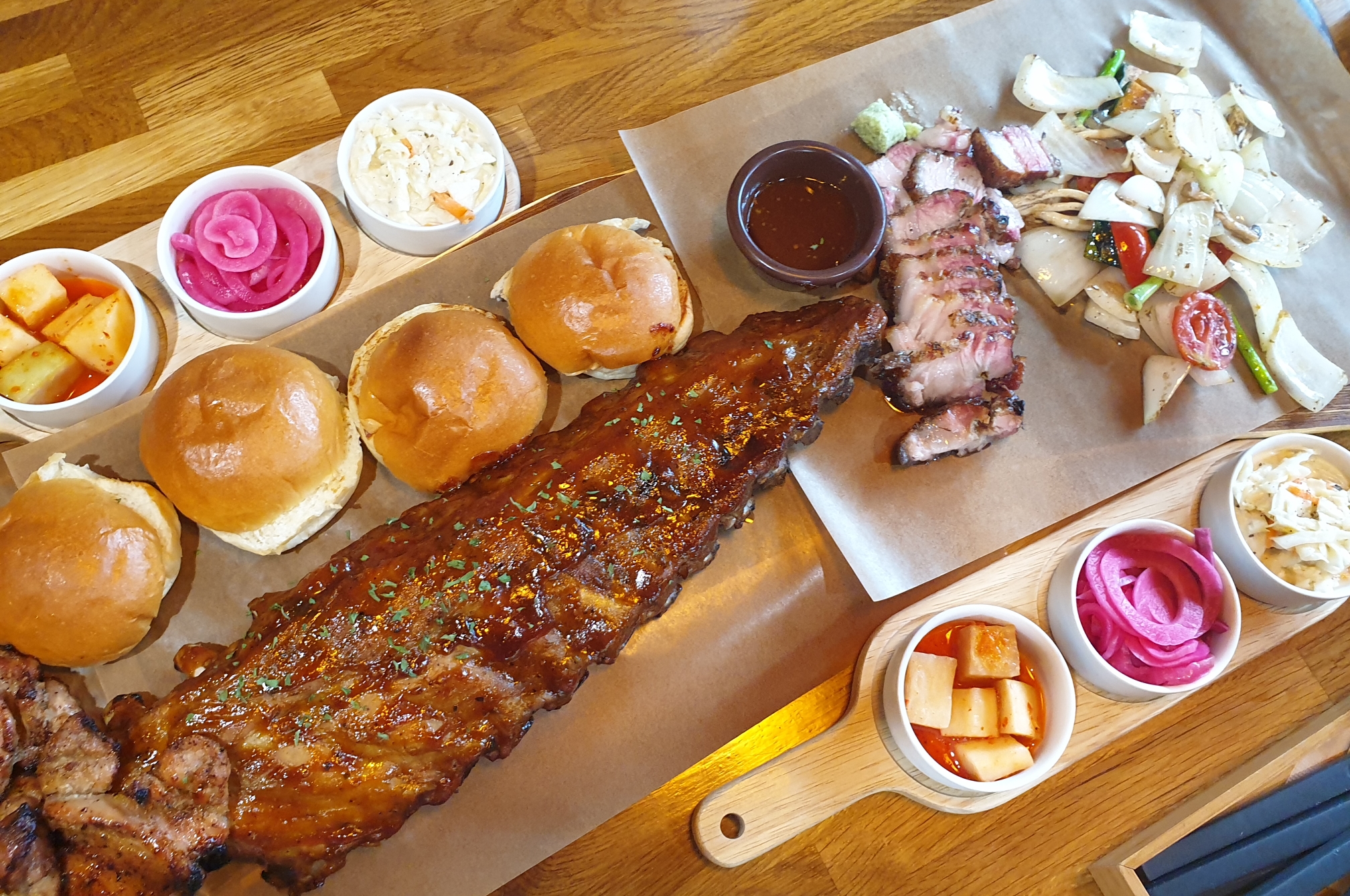 드디어 나왔습니다!! 아니 이게 뭔가요ㅎ 음식 나오자마자 눈이 휘둥그레~~ 부위별 고기들과 감자튀김, 구운 채소, 모닝빵.. 새로운 조합의 음식이네요. 일단 기다란 비주얼 합격!ㅋ