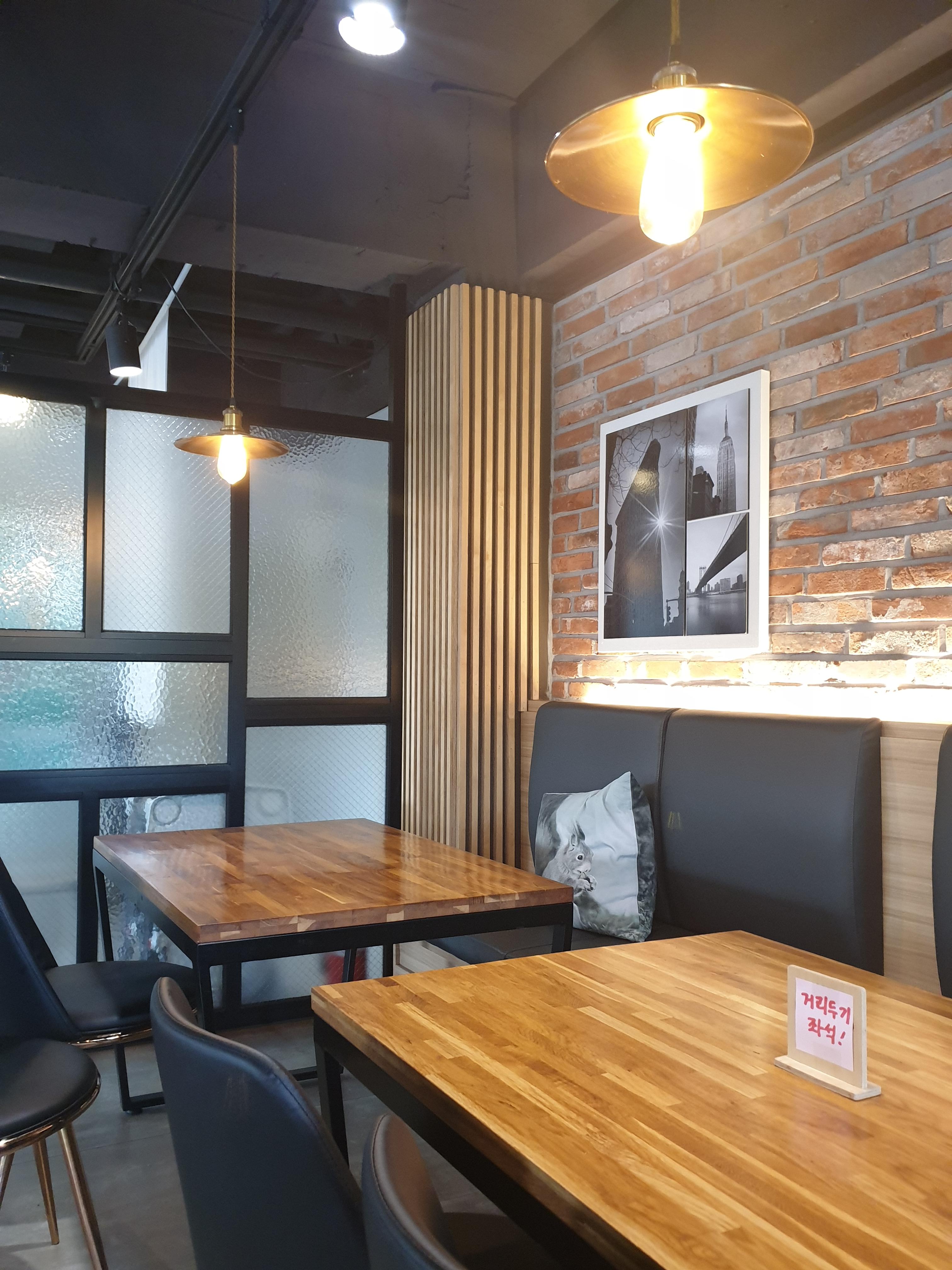 거리두기 좌석 표시도 곳곳에 보이구요, 원목테이블에 의자도 편해서 전체적으로 아늑하고 따뜻한 느낌의 가게였어요. 아, 그러고보니 메뉴판을 못 찍었네요. 지인이 한 번 와본 가게라 해서 메뉴선정을 맡기고 가게 구경하기에 바빴ㅎㅎ