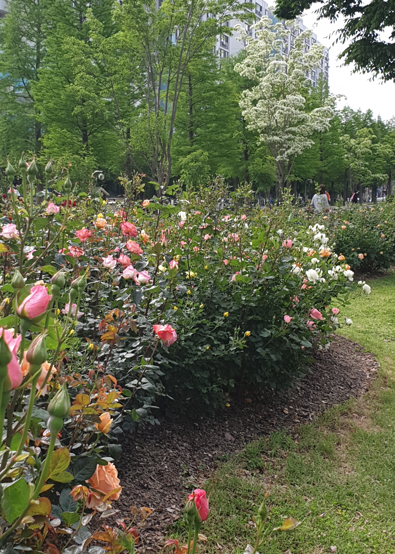 산책로에 들어서니 여러 색감의 장미들이 반겨주네요. 흰색 핑크색 오렌지색 빨간색 노란색.. 누가 누가 더 이쁘나 경쟁하는 듯 미모를 뽐내고 있습니다. 포항의 시화(대표하는 꽃)가 장미라고 해요. 그래서 5월이면 곳곳에서 장미를 많이 볼 수 있답니다.