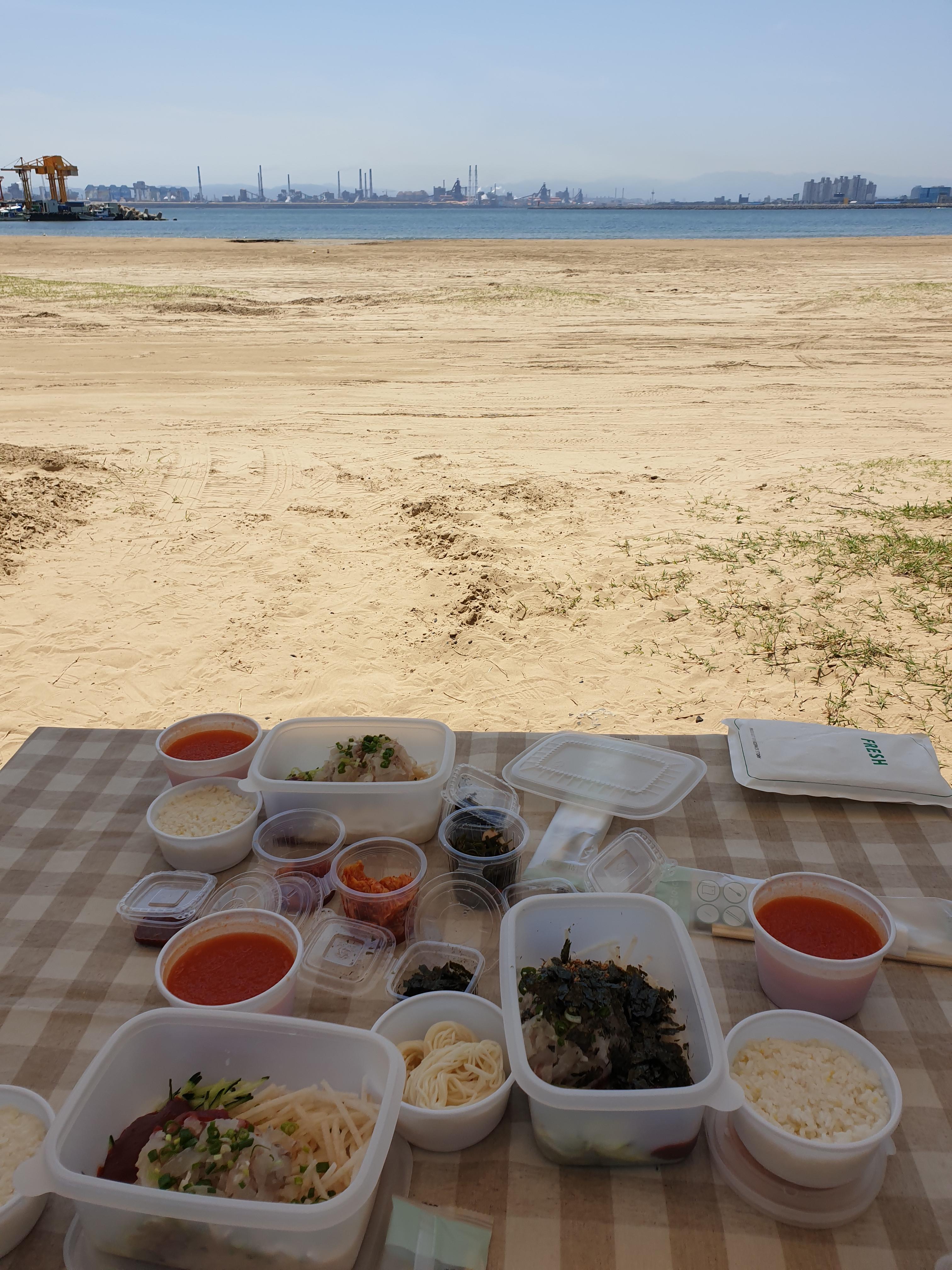 실내에서 먹자니 코로나도 살짝 걱정되고 앞에 이 멋진 풍경을 외면하기도 아쉬워 포장을 해서 나왔습니다. 커다란 그늘막 아래 자리를 잡고 돗자리 위에 한 상 차려 보았네요ㅎㅎ 은근 캠핑 느낌 나는데요?