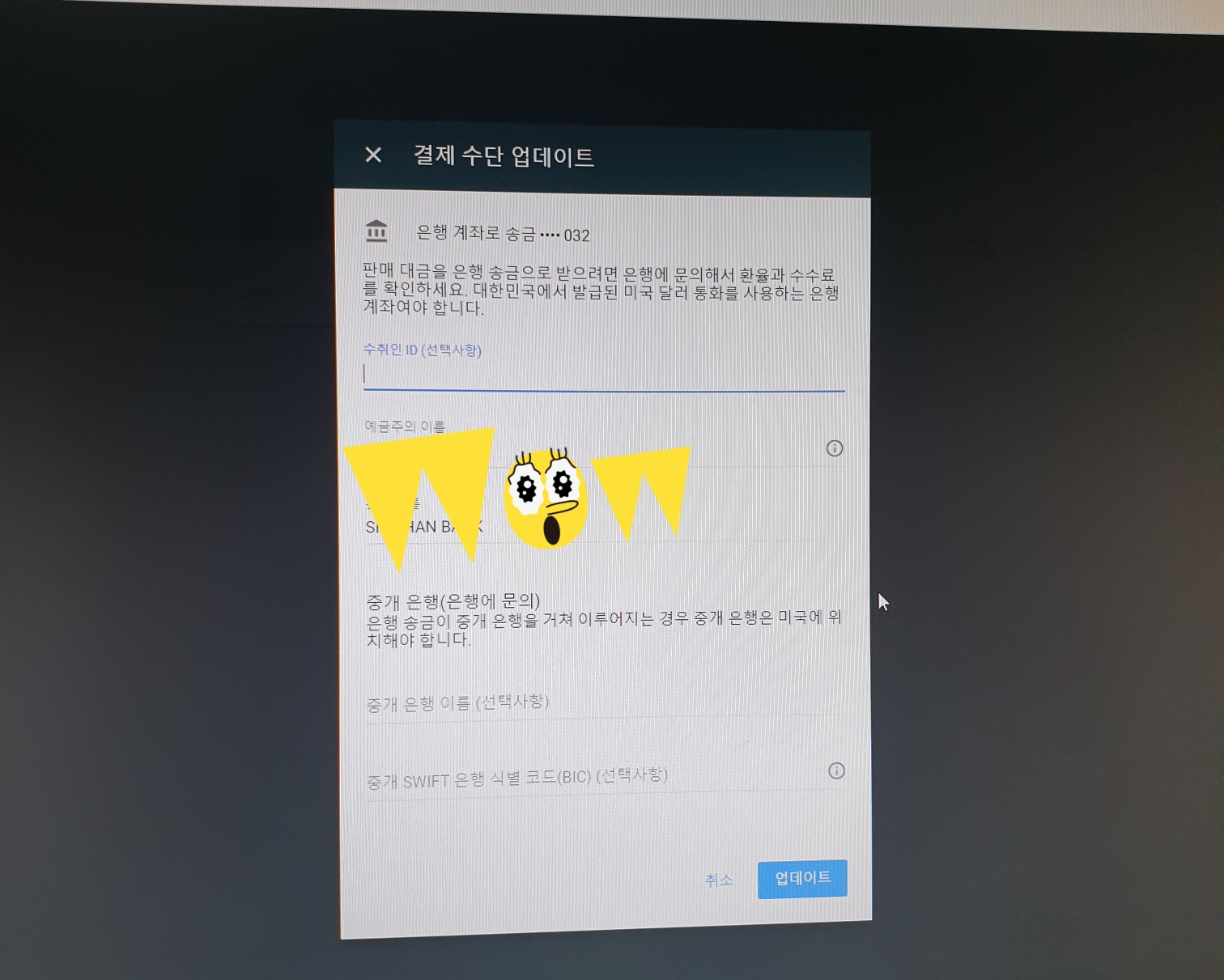 시키는대로 모든 항목을 기재하고 드디어 완료!! 제가 가진 계좌로 애드센스 수익이 들어올 경우 달러가 원화로 환전되어 들어오니 안그래도 적은 수익 좀 더 적어질 수도 있겠지만ㅋㅋ 무튼 기분은 좋네요. 이웃님들에게도 좋은 소식 많길요^^