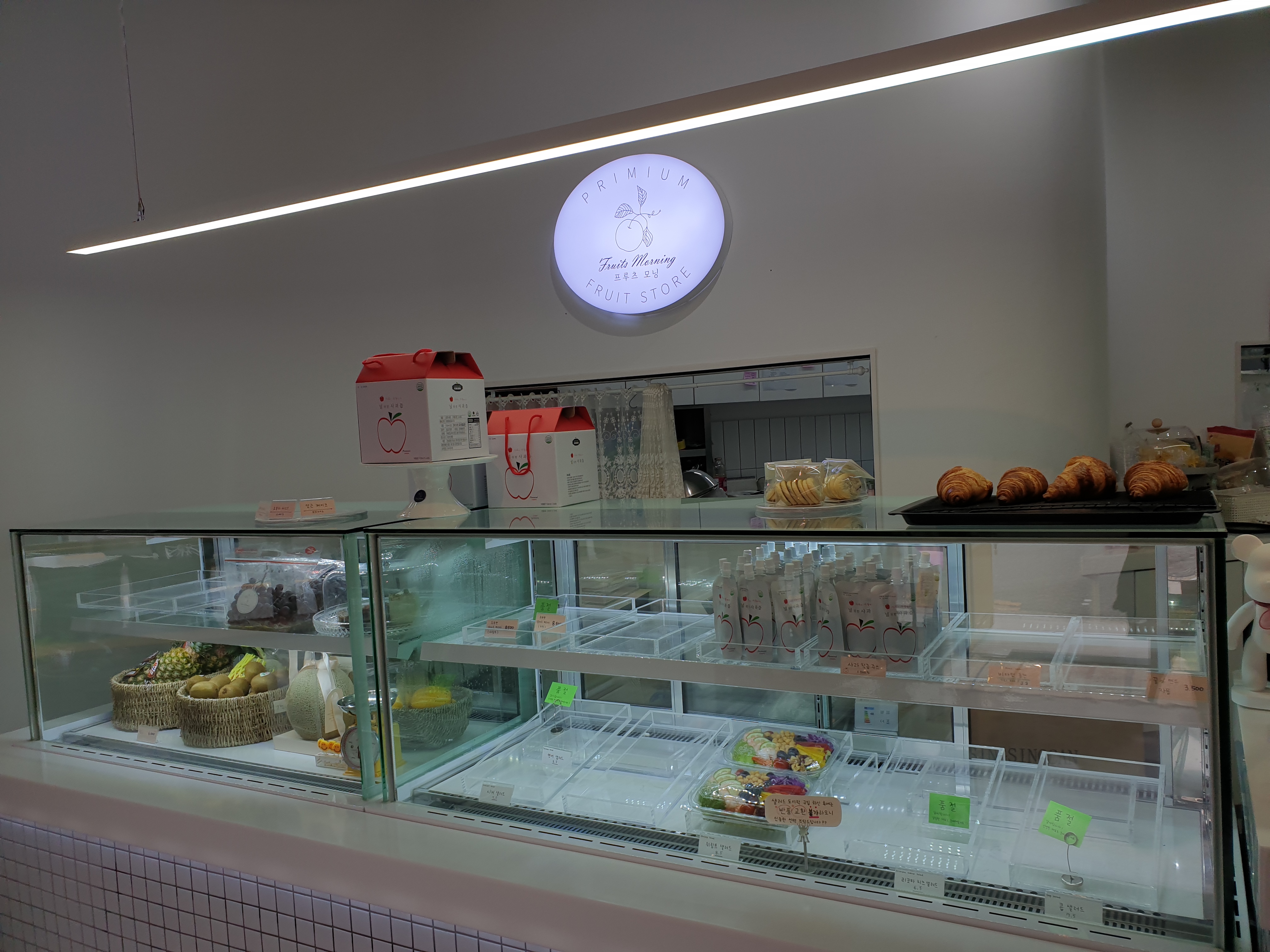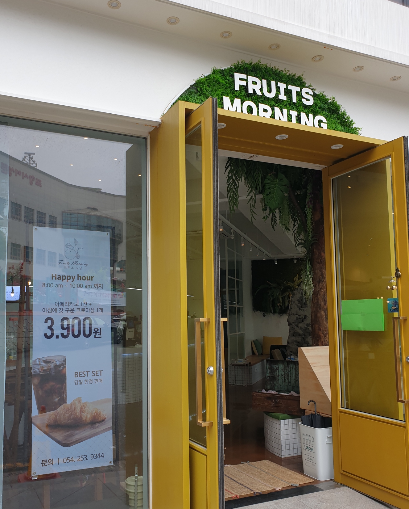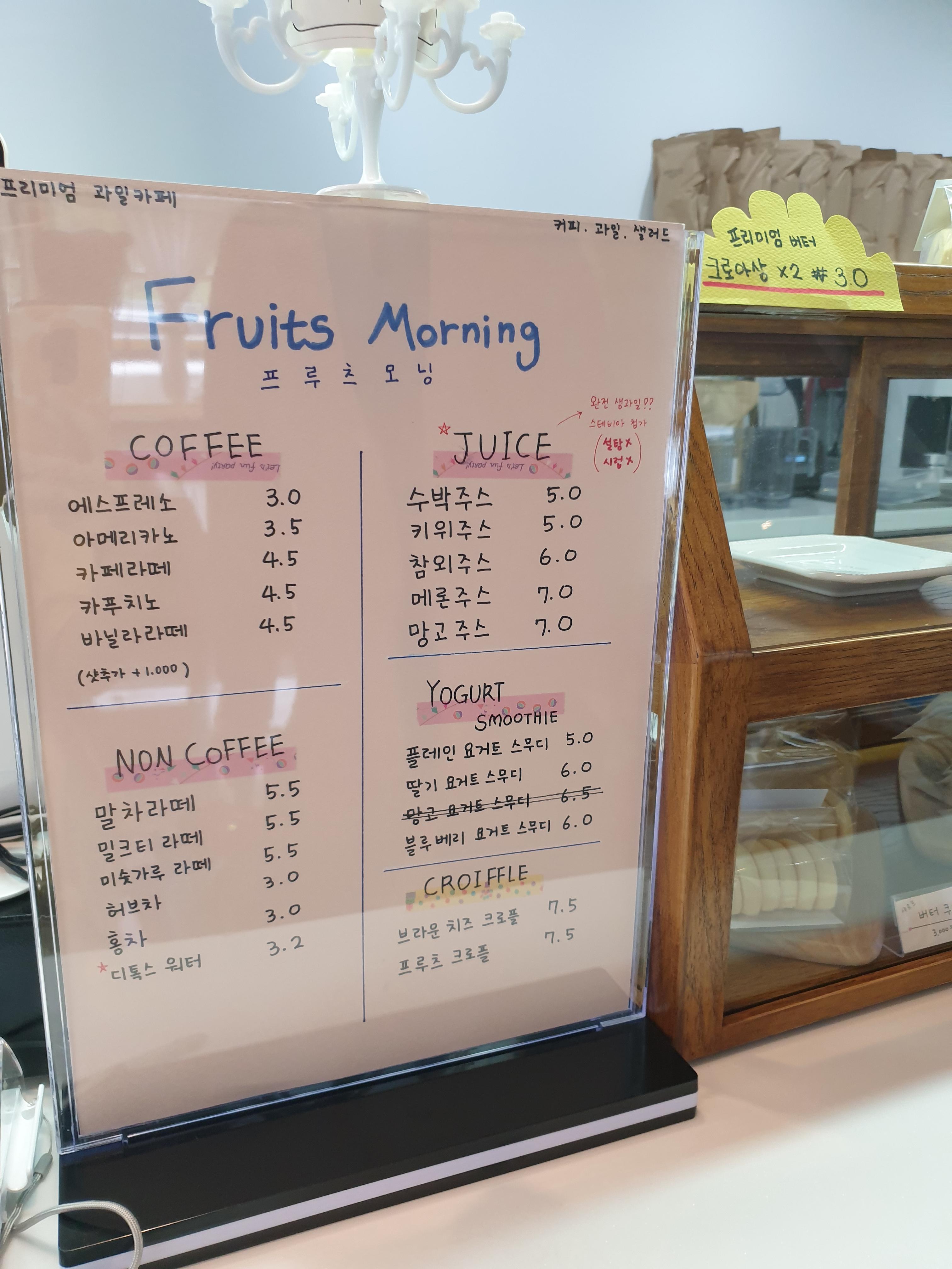 푸르츠 모닝은 프리미엄 과일카페라고 하네요(메뉴판 상단에 그리 적혀 있음ㅋ). 그래서 그런지 곳곳에 과일들이 많이 보이더라구요. 과일주스도 다양하네요. 수박, 키위, 참외, 메론, 망고주스~~ 이름만 들어도 상큼ㅋㅋ 다 먹어보고 싶지만.. 오늘은 아메리카노와 크로아상 세트를 시켜봅니다. 아침에만 세트 3,900이니까요!
