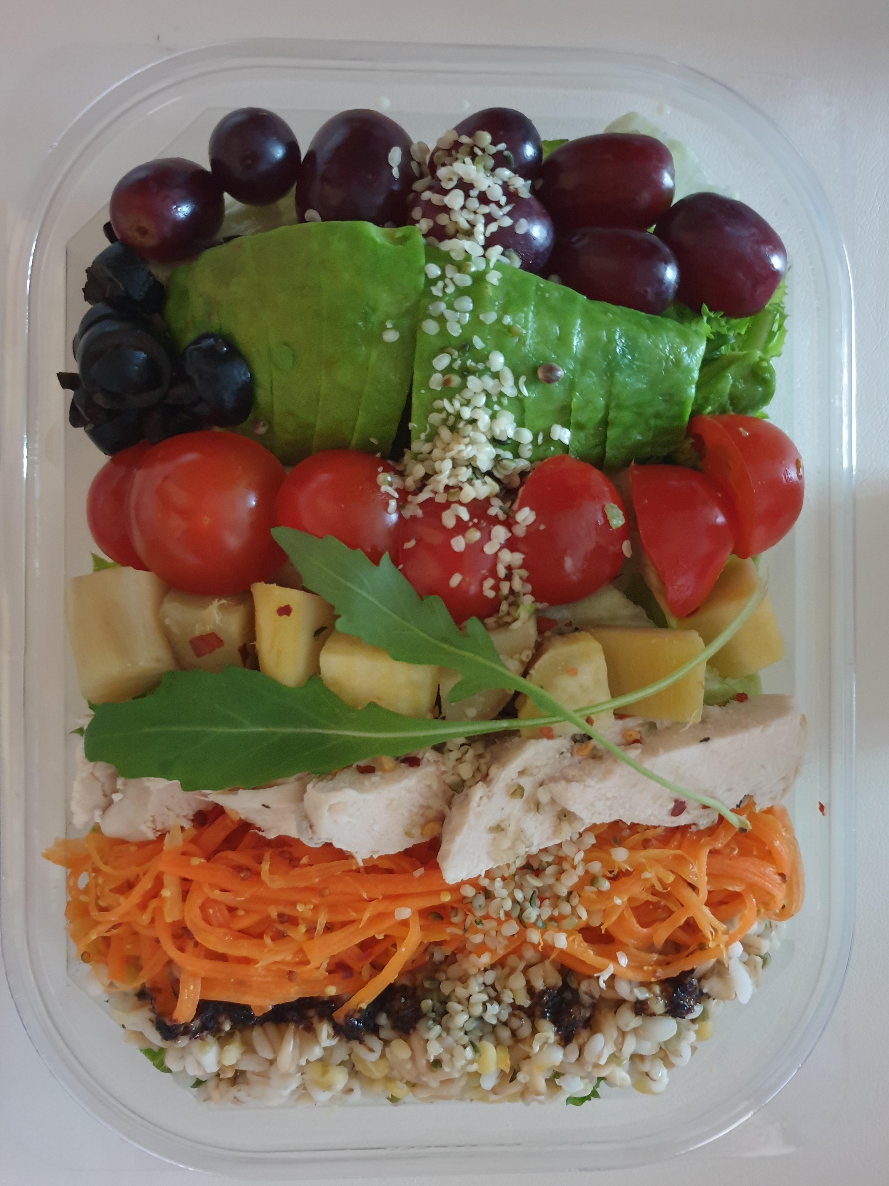 다음은 콥샐러드~!! 딱 봐도 넘 먹음직스럽죠? 제가 좋아하는게 많이 들어가 있더라구요. 다양한 과일, 올리브, 아보카도, 고구마, 닭가슴살, 야채들.. 보기만 해도 건강해지는 느낌ㅋㅋ 함께 넣어주신 발사믹 소스를 샤샤샥 뿌려 먹어 봅니다. 진짜 꿀맛이었네요. 가격대가 있어서 자주는 못 사먹겠지만 많이 생각날 때 한 번씩 사먹고 싶네요ㅎ