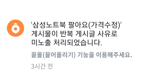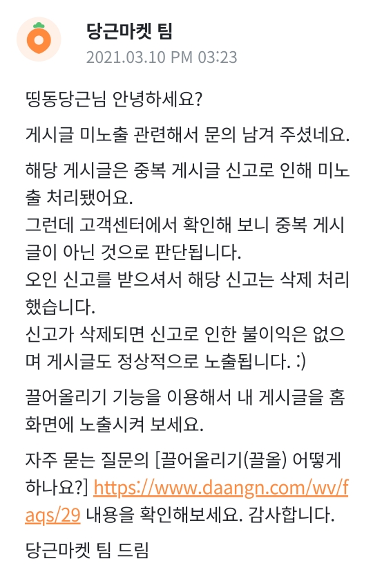 당근마켓에서 중복게시물이 아님에도 미노출 알림을 보낼때 대처 방법에대하여 안내합니다.