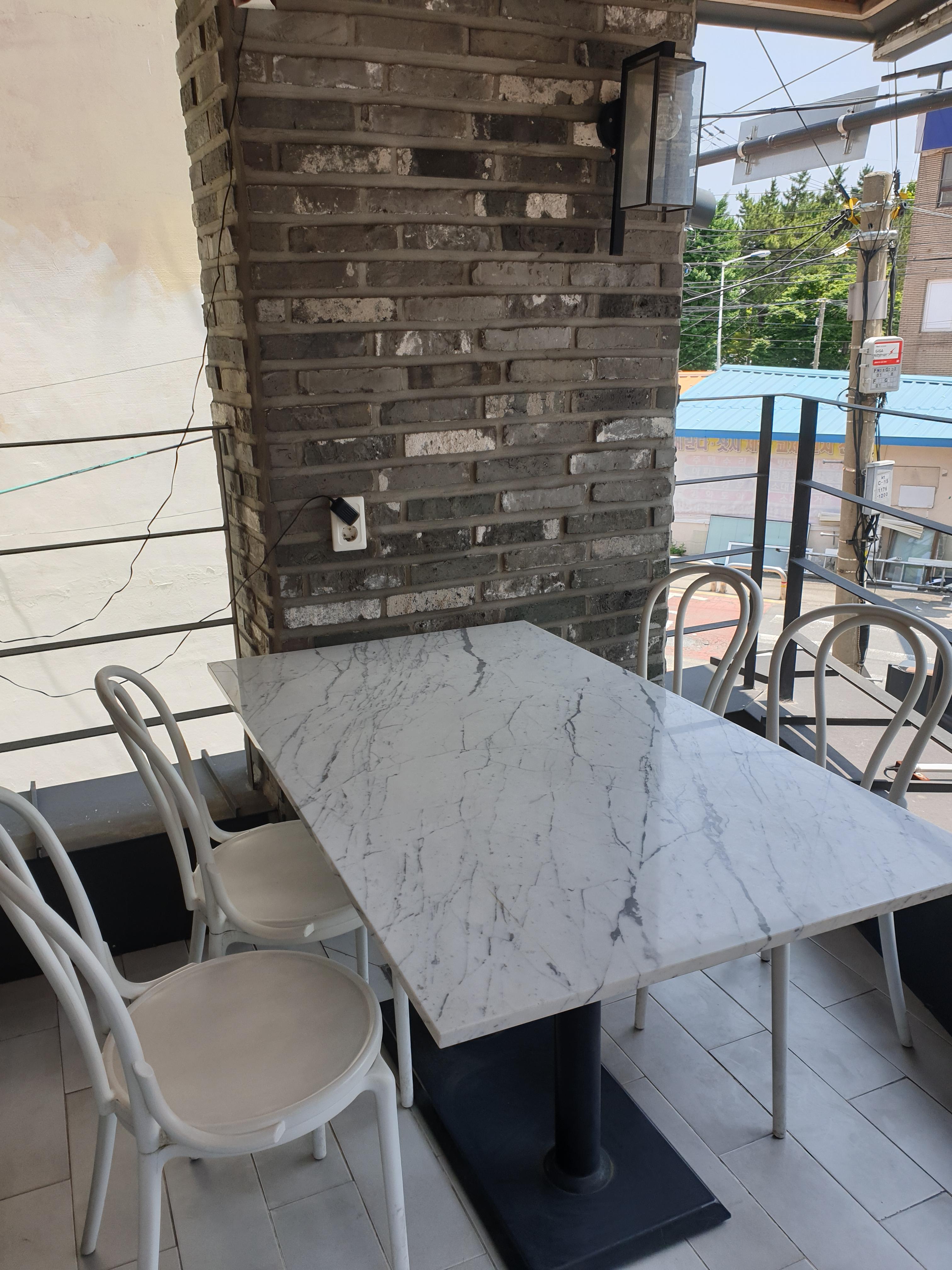 2층에는 바다가 살짝 보이는 테라스에 테이블이 하나 있었는데 (코로나 이후론 식당 가게 되면 야외 테라스 자리 선호하거든요ㅠ), 먼지가 많아서 포기하고 실내로 들어왔네요;;