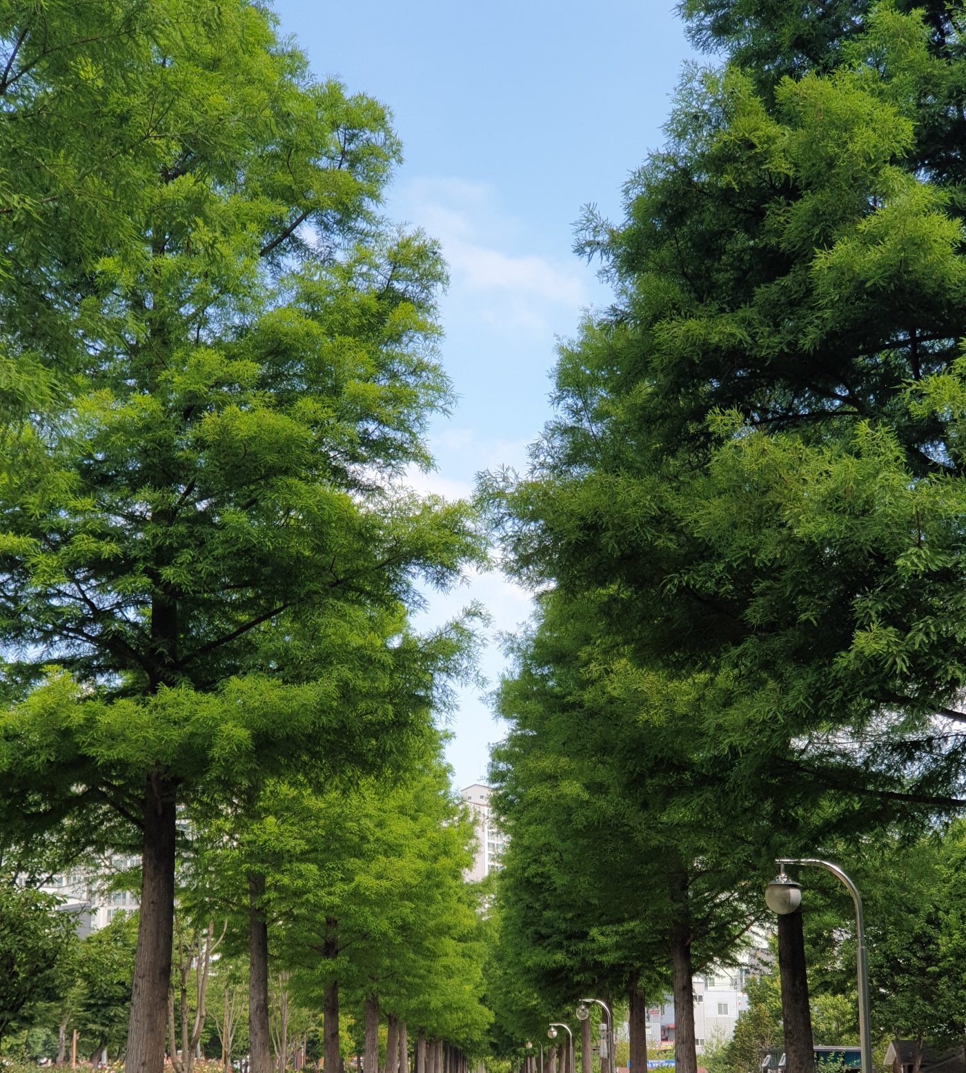 이건 오늘 아침 산책길에 찍은 메타세콰어들~~^^ 여름이 되며 잎이 아주 무성해 져서 양쪽 나무들끼리 악수할 것 같아요ㅎㅎ