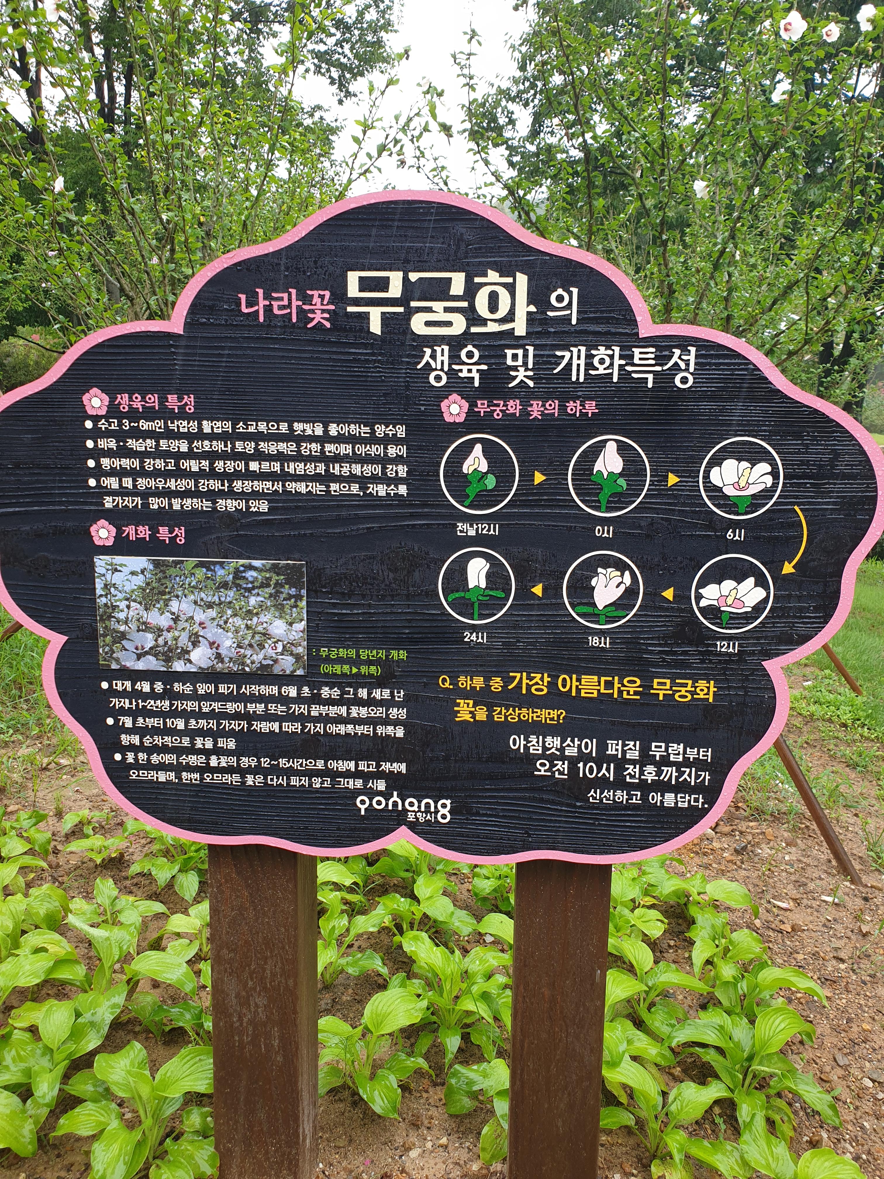 우리나라 꽃 무궁화의 생육 및 개화특성도 설명되어 있어 아이들과 함께 공부도 하며 구경하기 좋을 듯 해요. 하루 중 가장 아름다운 무궁화를 감상하려면 아침햇살이 퍼질 무렵부터 오전 10시 전후까지가 제일 좋다고 하네요!