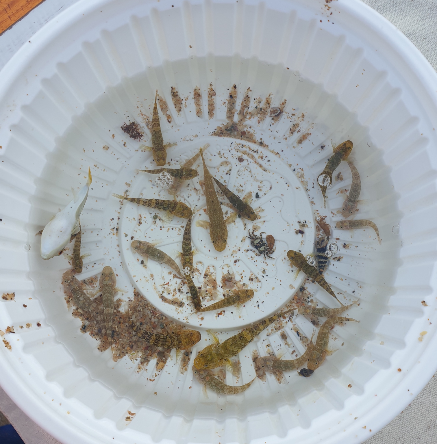 지난 주말, 바다에 가서 잡은 물고기들~~ 요즘 아들이 물고기 잡기의 매력에 푹 빠져 물만 만나면 물고기 타령ㅎㅎ 운 좋게 다양한 종류의 고기들을 만났습니다. 왼편에 하얀색 물고기 보이시나요?