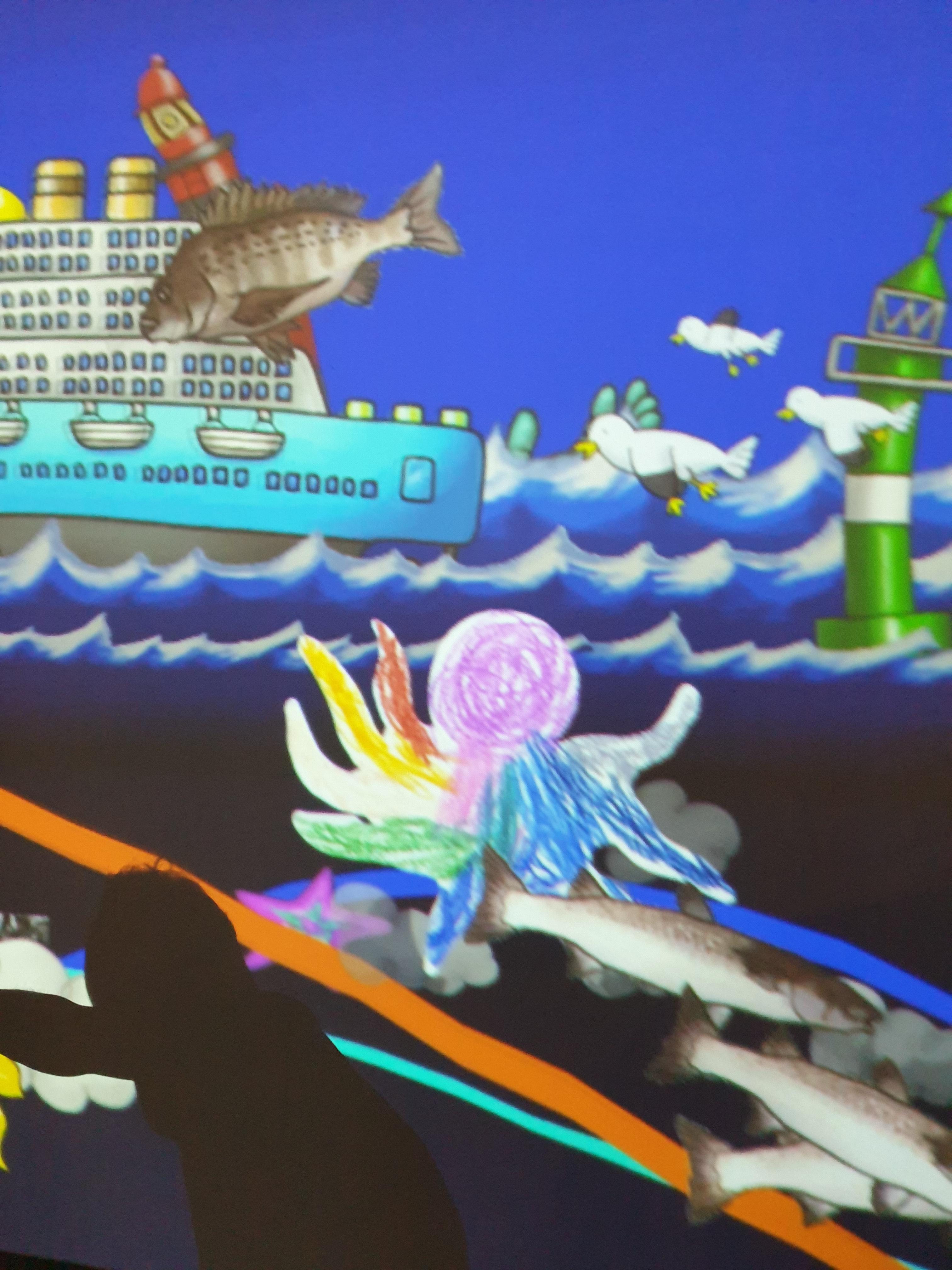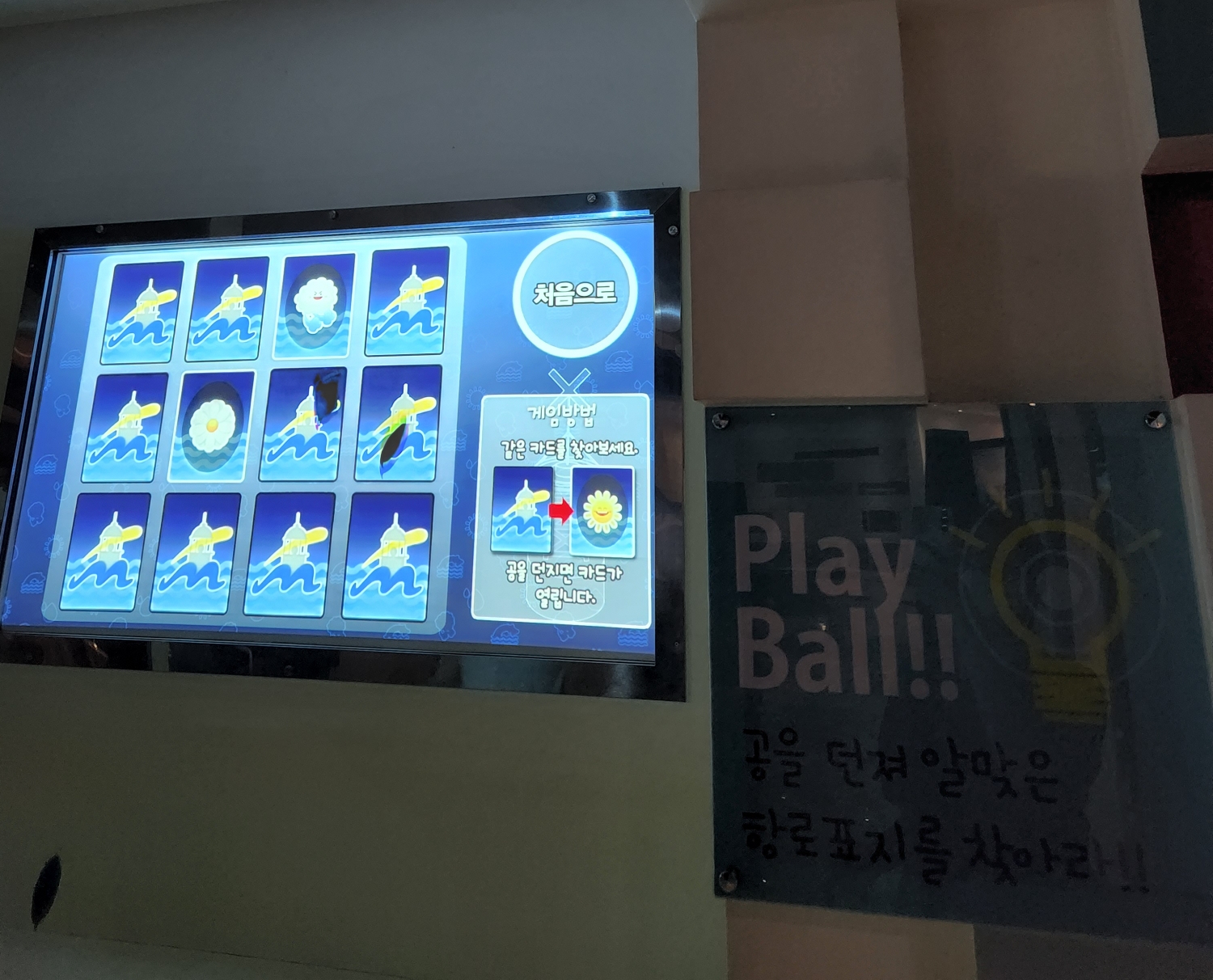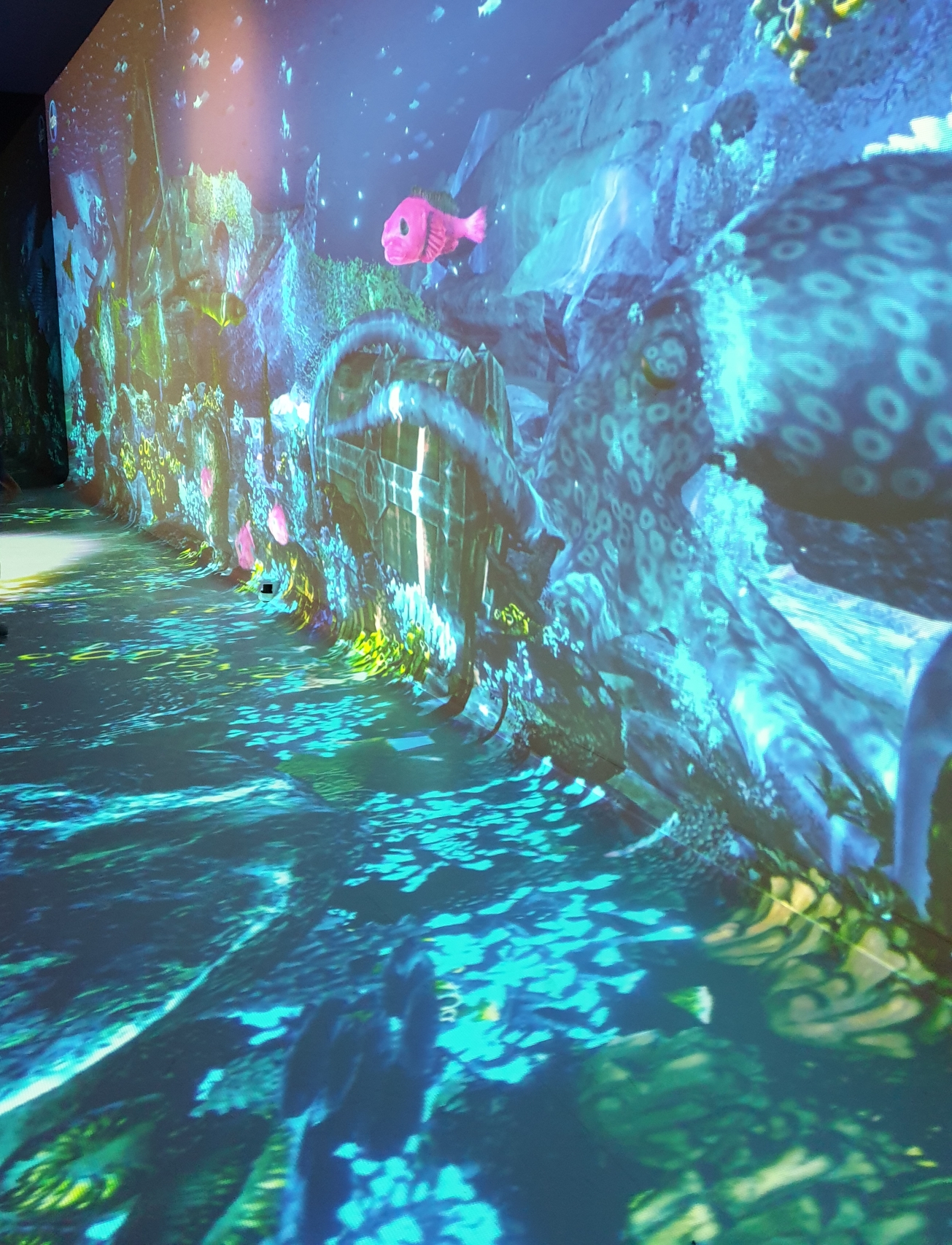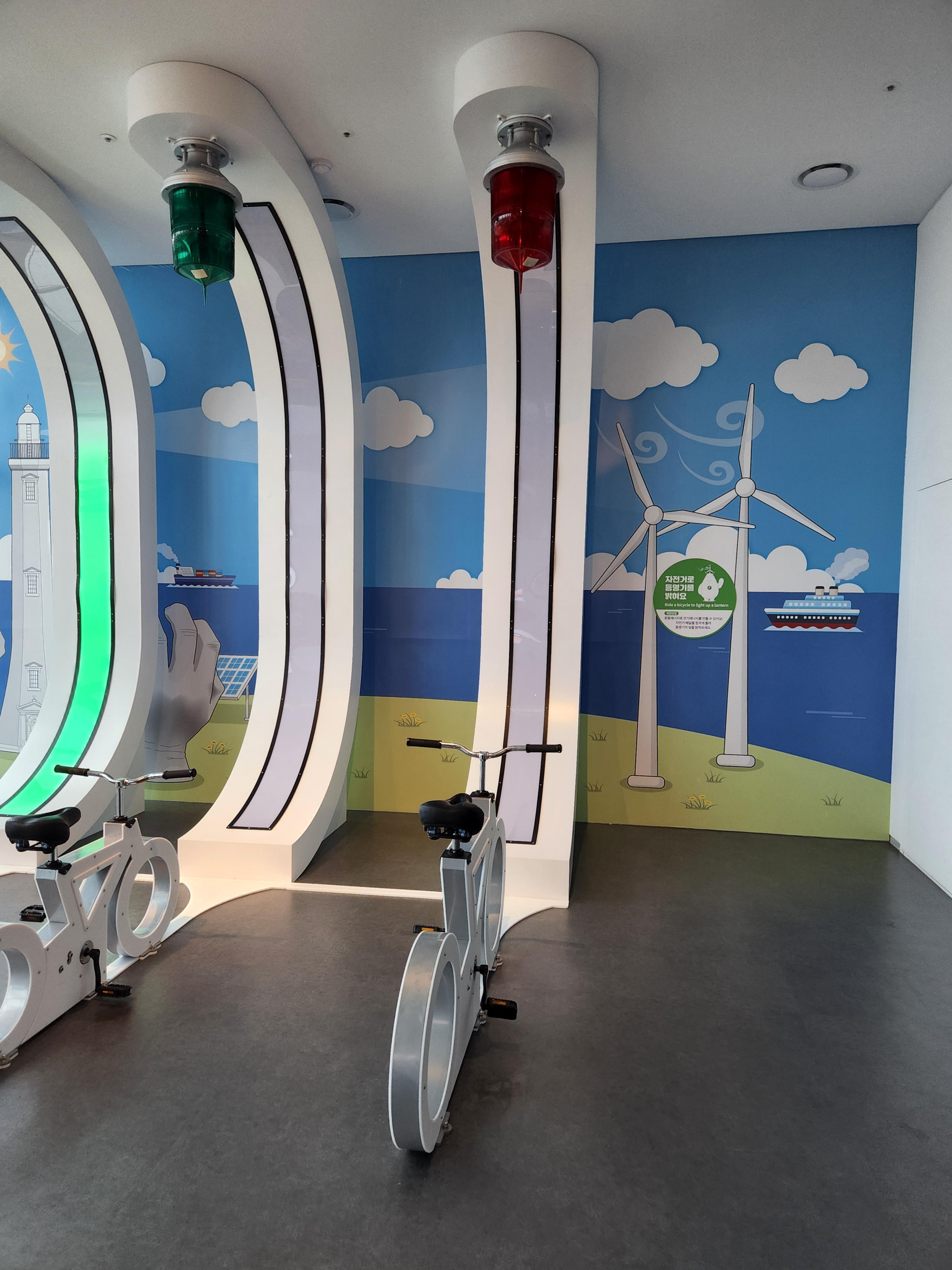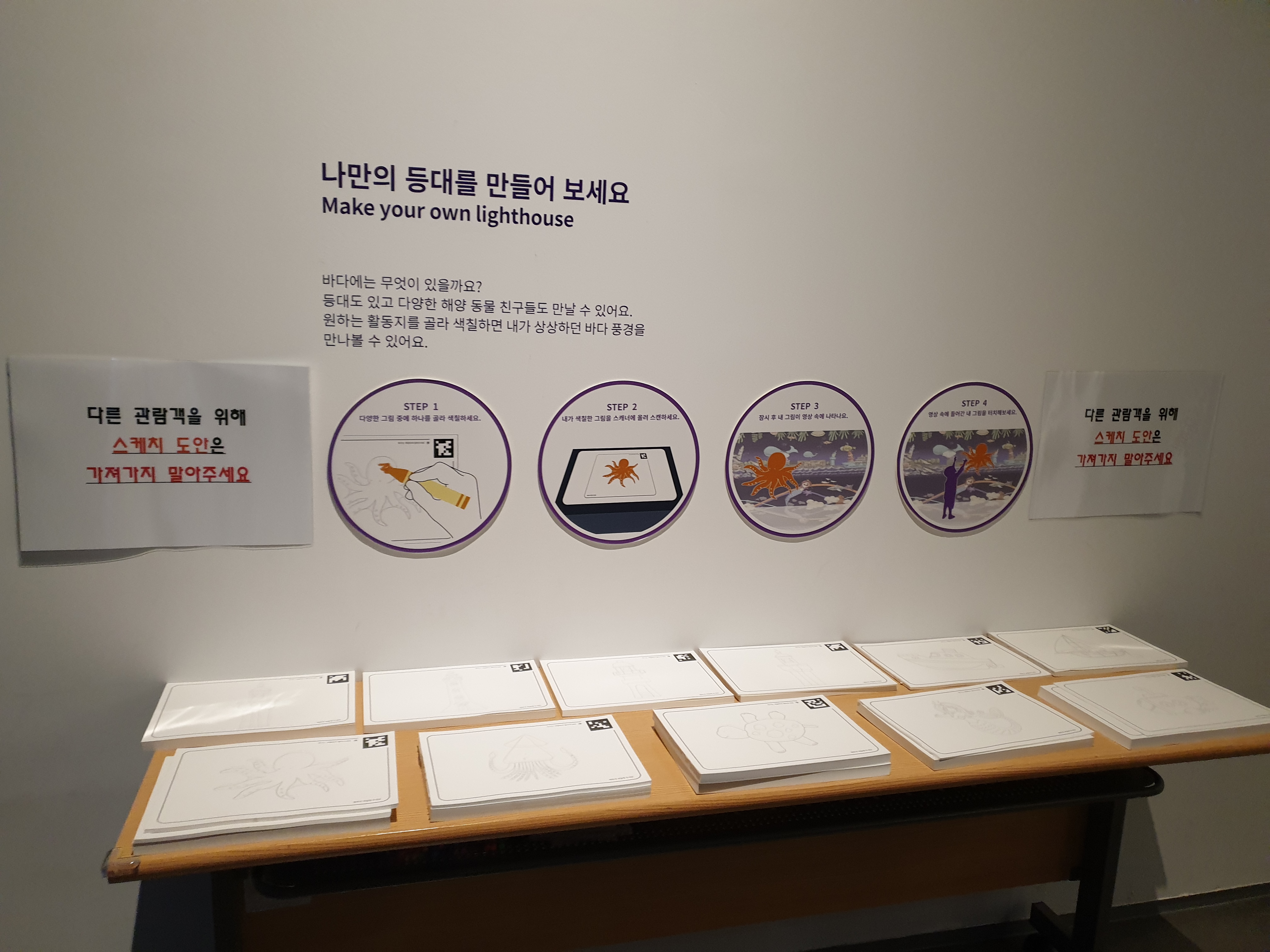 아이들이 너무 좋아한 공간! 한쪽 벽면 가득 등대부터 바다속 그림들이 영상으로 크게 나오고 바닥을 밟으면 빛이 번쩍번쩍 해서 뛰어 보기도, 콩콩 점프하기도 하면서 맘껏 즐길 수 있었어요.