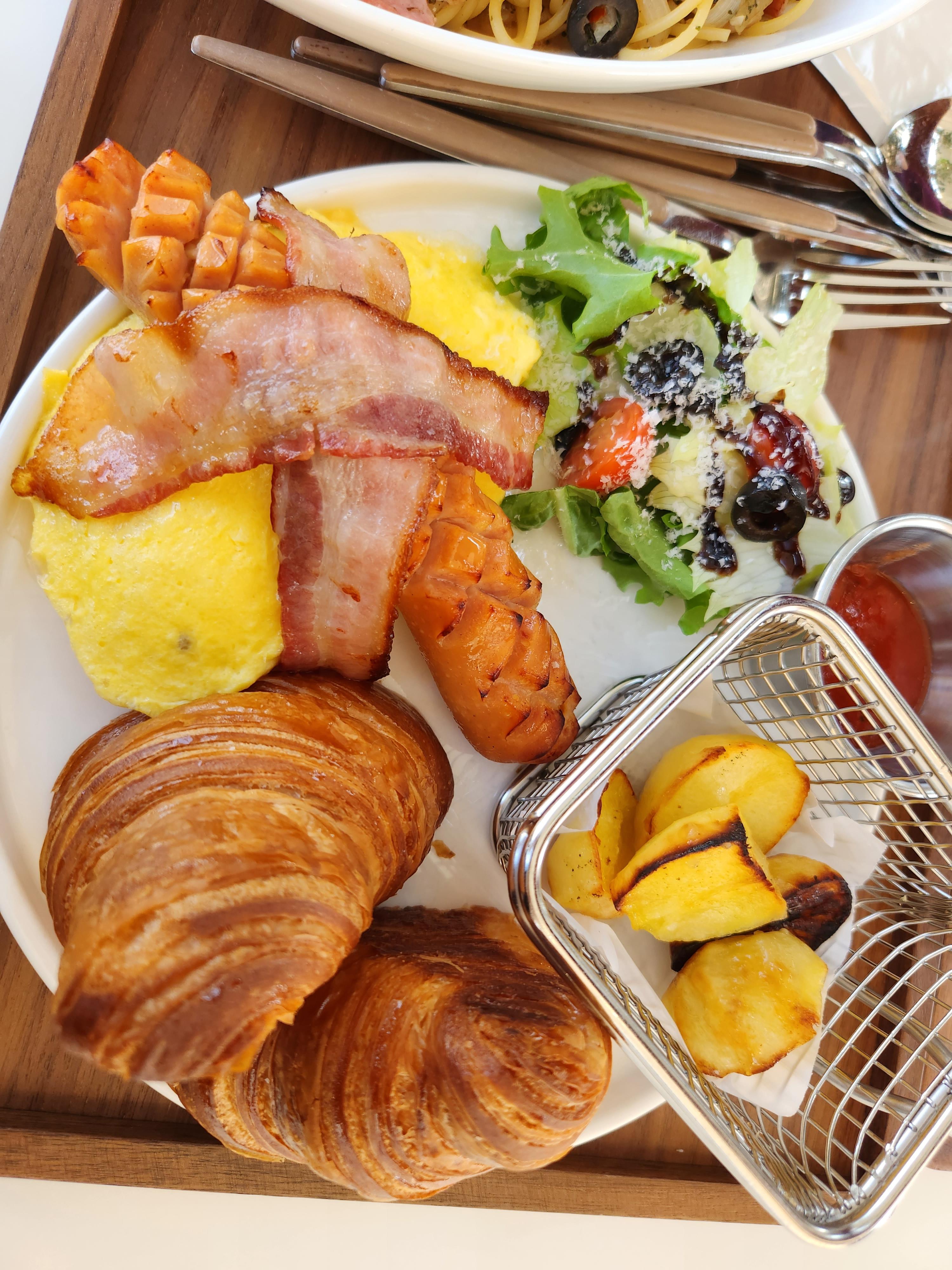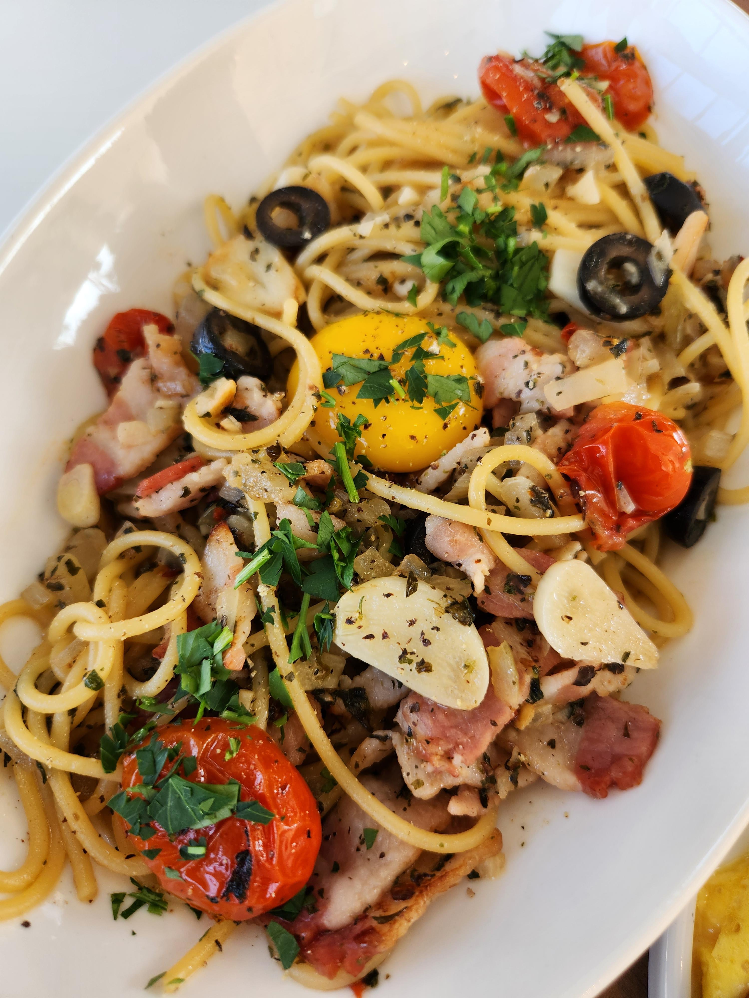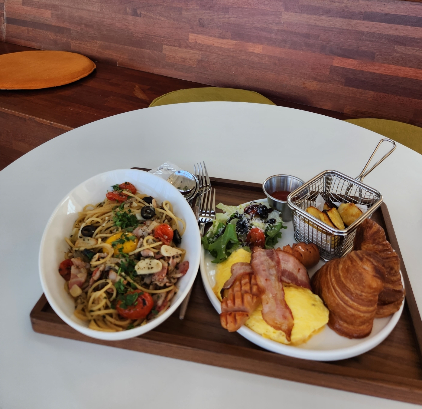 대표메뉴인 레이틀리 에그볼 오일 파스타와 유러피안 브런치 세트입니다.