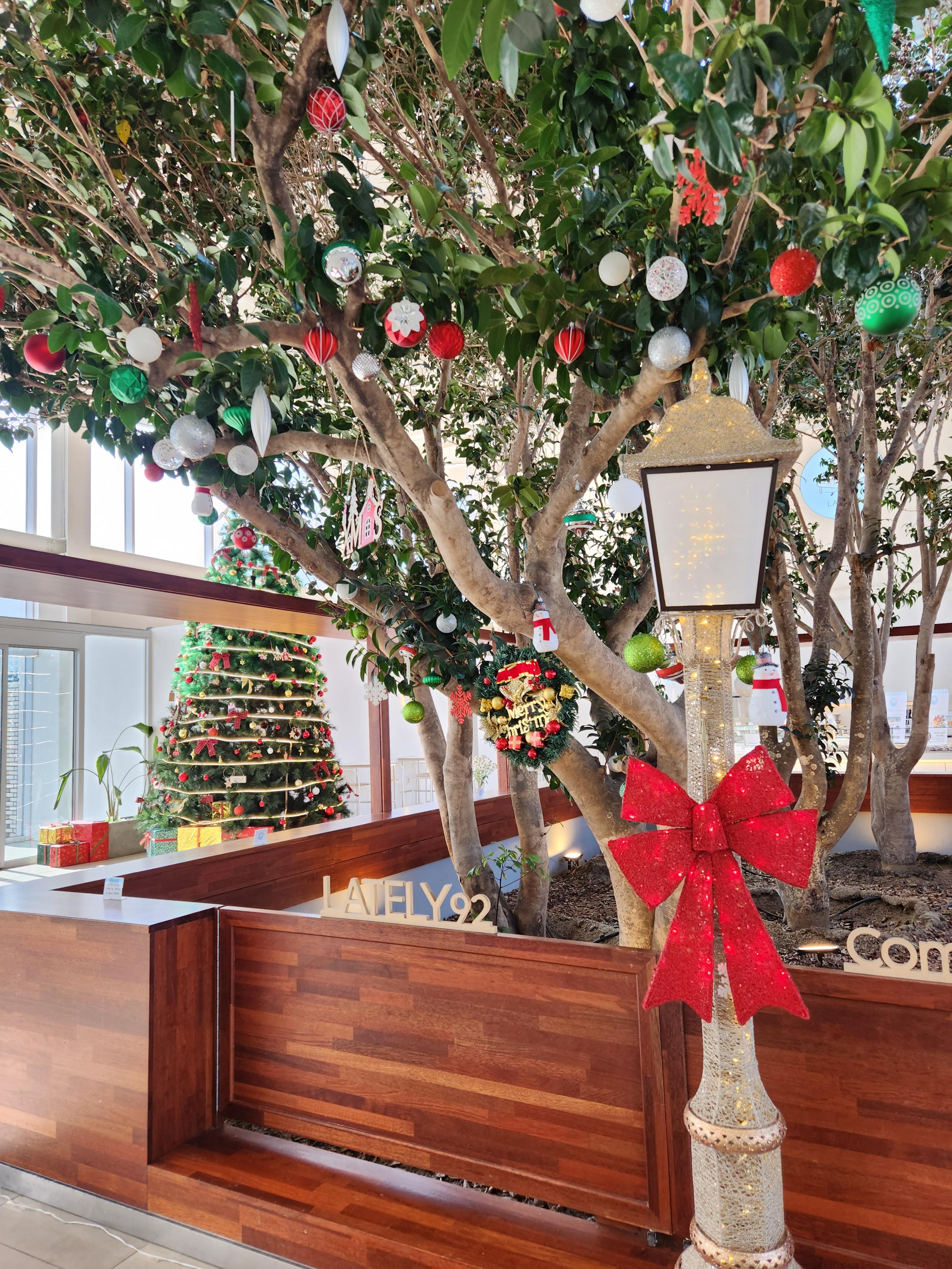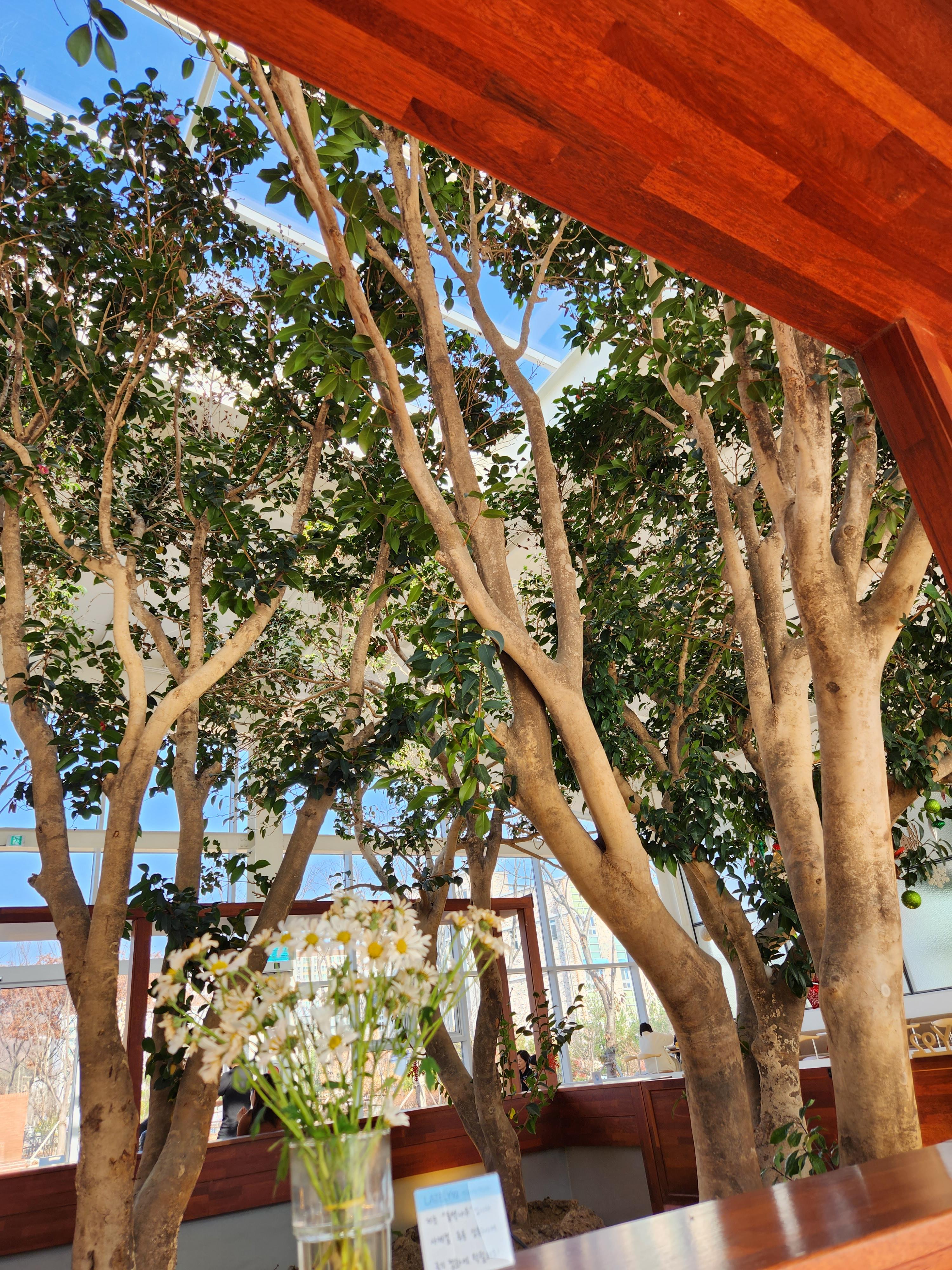 카페 중앙의 이 커다란 나무는 동백나무라고 해요.