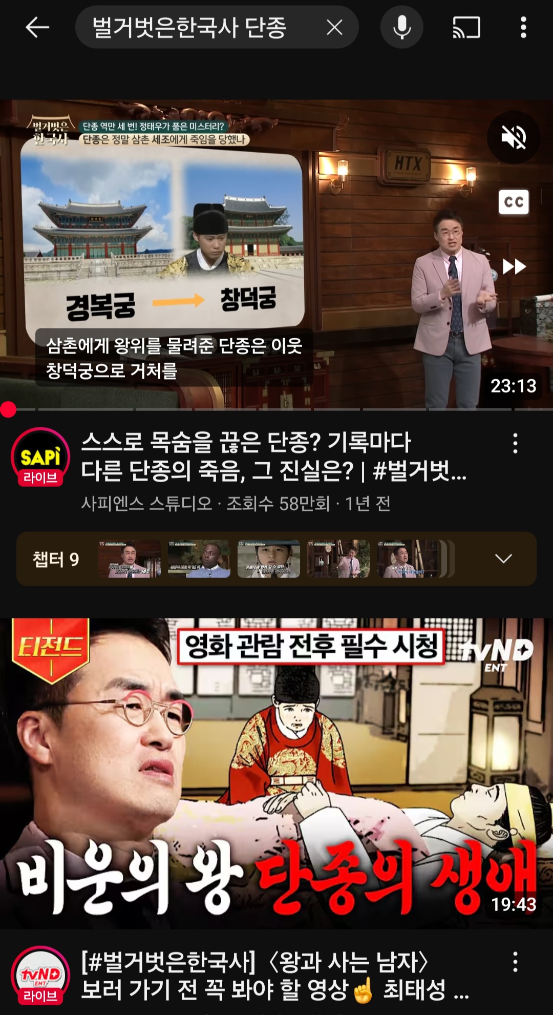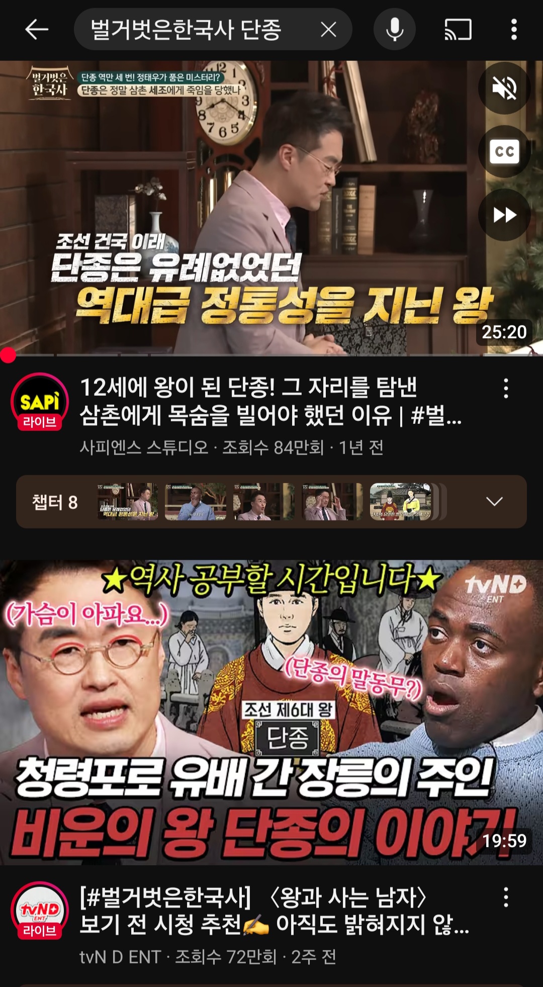 유튜브에서 '벌거벗은 한국사 단종'을 검색하니