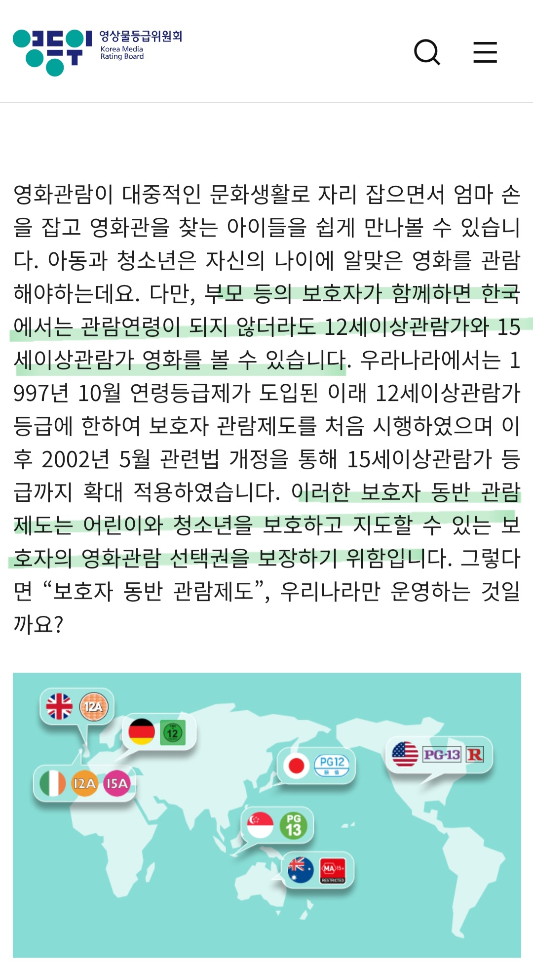 영상물 등급 위원회에 따르면, 우리나라는 부모 등의 보호자가 함께하면 가능하다고 하네요.